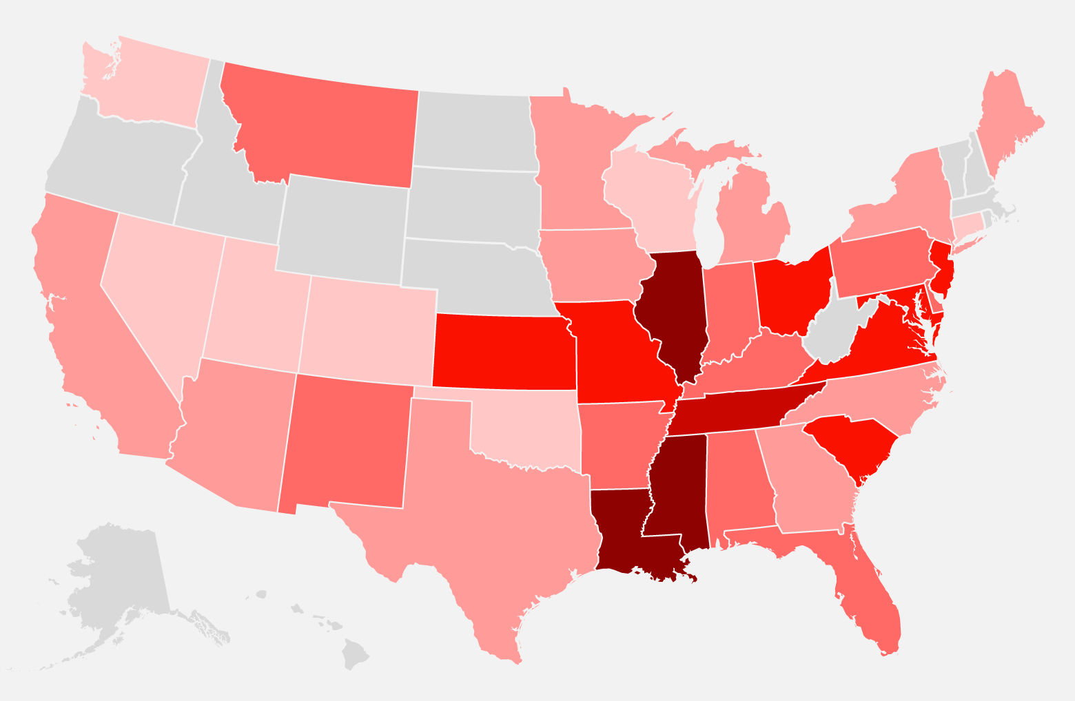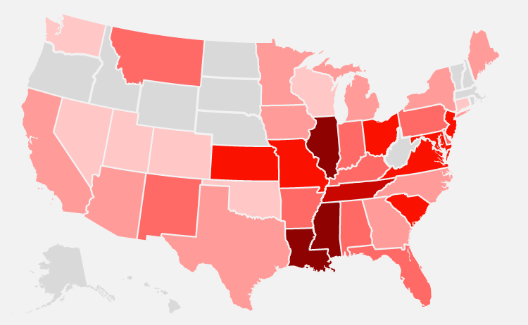 in which four or more people were injured or killed. This map shows the number of shooting incidents, per 5 million residents, in each state.