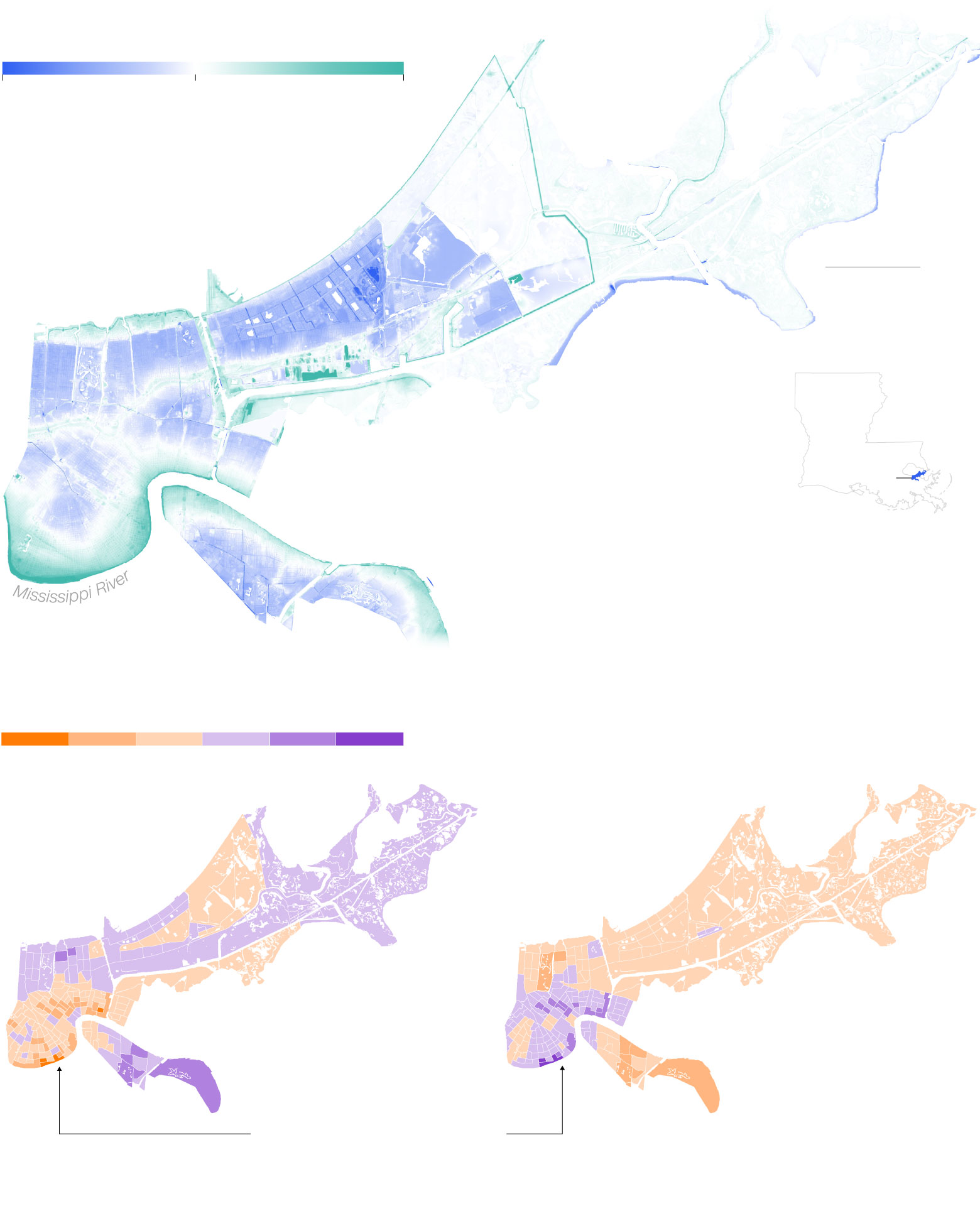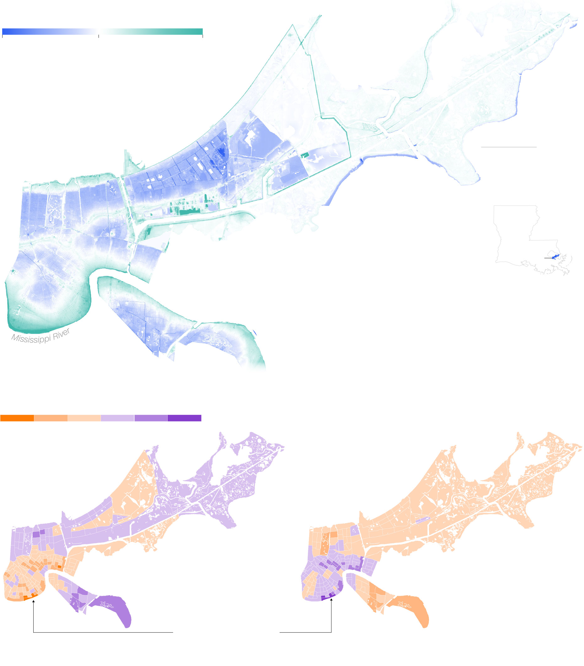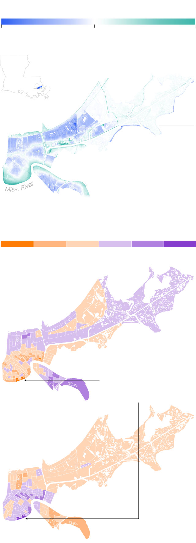Areas with higher elevations saw large declines in Black population. One tract in the Irish Channel neighborhood went from 74% Black in 2000 to 71% White in 2019.