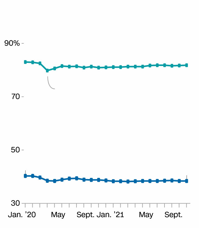 The labor force participation rate has not returned to pre-pandemic levels for either age group.