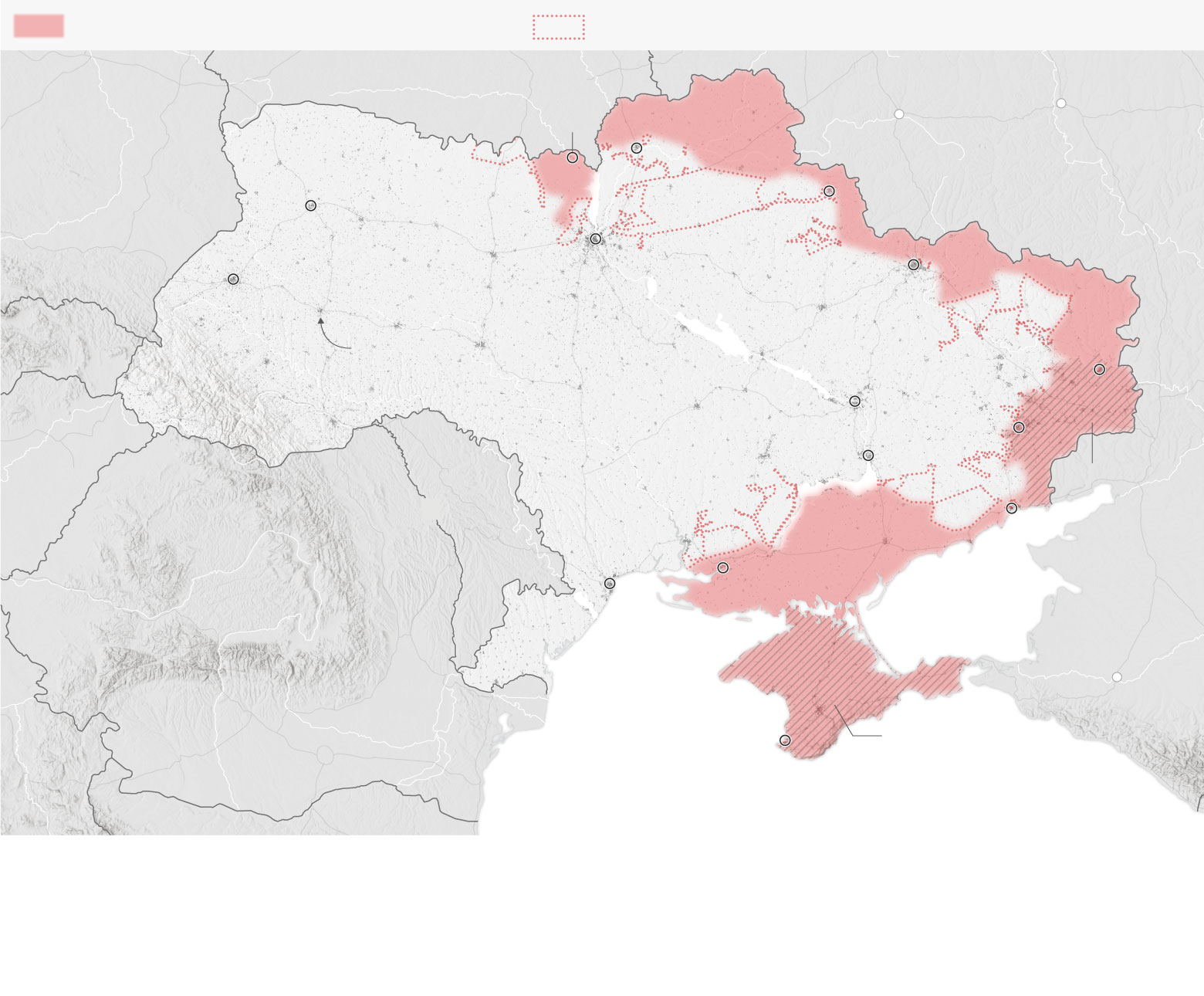 Sources: The Institute for the Study of War with AEI’s Critical Threats Project (Russian-occupied areas and advances); LandScan HD for Ukraine, Oak Ridge National Laboratory (population)